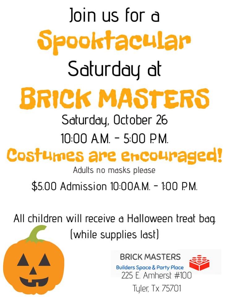 Wear your costume and celebrate a not-so-scary Halloween with Brick Masters on Saturday, October 26 from 10:00AM-5:00PM. Children will receive a treat bag (while supplies last). Admission will be reduced to $5 from 10:00-1:00. Please, no masks on adults.